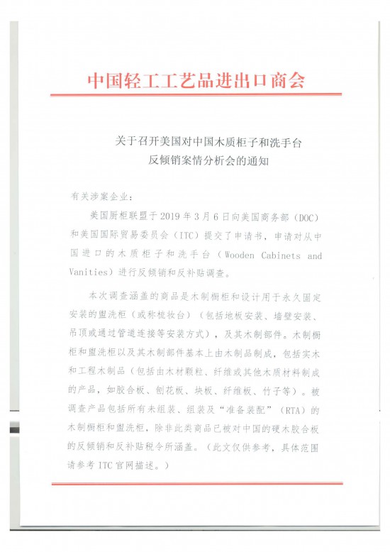 美國廚柜聯(lián)盟于2019年3月6日向美國商務(wù)部(DOC) 和美國國際貿(mào)易委員會(ITC)提交了申請書,申請對從中國逬口的木質(zhì)柜子和洗手臺(Wooden Cabinets and Vanities)進(jìn)行反傾銷和反補貼調(diào)查。