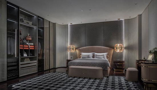 寬大厚重的扇形床屏,依然承襲該系列穩(wěn)重而不失時(shí)尚感的氣質(zhì)。傳承奢侈品牌的六邊形圖騰,巧妙地展現(xiàn)在床屏及床尾上。并且,床屏中線(xiàn)的圖案拼接,仍然嚴(yán)格遵守橫平豎直的原則,每個(gè)六邊形及左右部位均能連接成行,體現(xiàn)出苛刻的工藝要求。