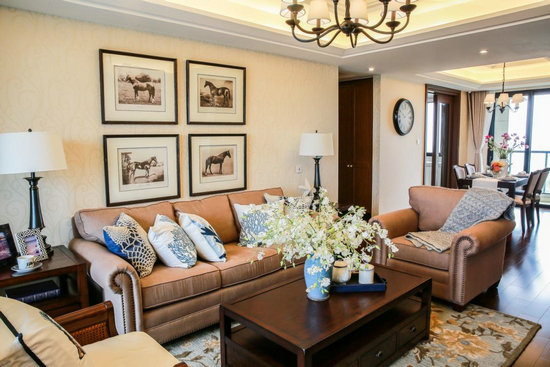 軟裝過(guò)程中,色彩搭配決定了居室整體氣質(zhì)。美式風(fēng)格傾向于沉穩(wěn)的濃色,如咖啡色、深桃花芯色,來(lái)奠定優(yōu)雅基調(diào)。對(duì)中小戶型而言,設(shè)計(jì)師點(diǎn)綴藍(lán)、白、綠、黃、粉等活力色彩,利用靠墊、擺件、花瓶等潮流單品,中和家具基調(diào),能為中小空間帶來(lái)一份輕盈。