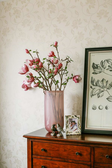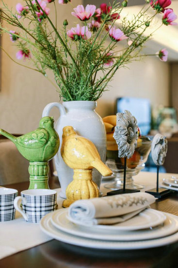 在基調(diào)沉穩(wěn)的餐廳以及臥室中,色彩鮮艷的仿真綠植及黃色、綠色小鳥(niǎo)擺件,緩和了美式家具的“濃妝”,為空間融入些許海洋、自然原野的風(fēng)味,更添趣味性。
