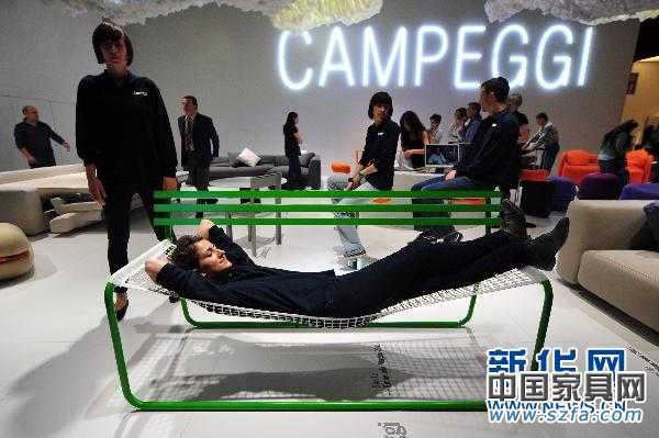 4月12日,一名男子在意大利第50屆米蘭國(guó)際家具展上體驗(yàn)一種新式“沙發(fā)”