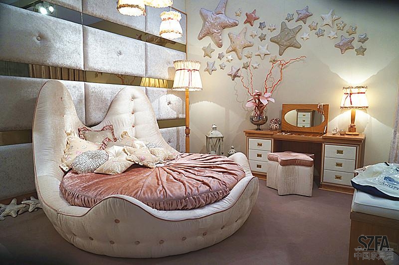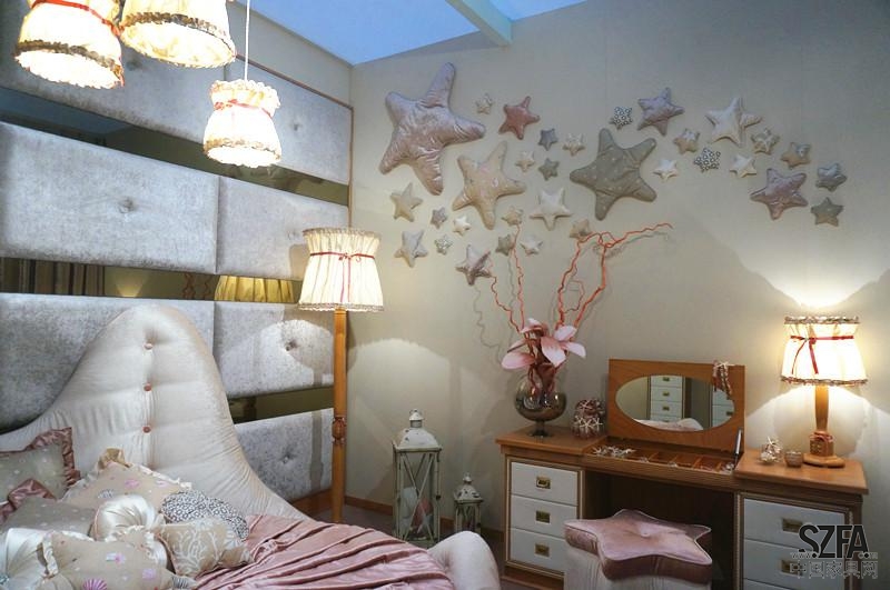 在這組家具中,裝飾品與墻上擴(kuò)散的海星連成一體,梳妝臺(tái)座椅也設(shè)計(jì)成星形,給人以強(qiáng)烈的主題印象。錯(cuò)落有致的燈具,讓空間瞬間立體了起來(lái)。