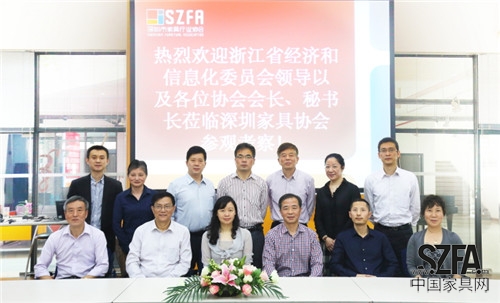 2014年11月28日,浙江省經(jīng)濟(jì)和信息化委員會(huì)法規(guī)處處長李丹、副處長鄭志靈與浙江省家具協(xié)會(huì)會(huì)長蔣鴻源、浙江省三會(huì)秘書長吳祎泓、浙江省品牌促進(jìn)會(huì)秘書長徐偉榮、浙江省軟件協(xié)會(huì)秘書長屠嬌絨、浙江省保健協(xié)會(huì)秘書長張艷、浙江省服裝協(xié)會(huì)秘書長沈茉莉、浙江省投融資傳協(xié)會(huì)秘書長威健明、浙江省照明協(xié)會(huì)秘書長許紀(jì)生、浙江省中小企業(yè)協(xié)會(huì)副秘書長張凱、浙江省燃器具協(xié)會(huì)副秘書長樂加礎(chǔ)一行在深圳市家具行業(yè)協(xié)會(huì)秘書長洪小惠的陪同下參觀考察深圳市家具行業(yè)協(xié)會(huì),觀摩了深圳家協(xié)包括會(huì)展策劃、設(shè)計(jì)研發(fā)、傳媒中心、集成研發(fā)、產(chǎn)業(yè)規(guī)劃以及檢測(cè)中心在內(nèi)的七大模塊運(yùn)作現(xiàn)狀。