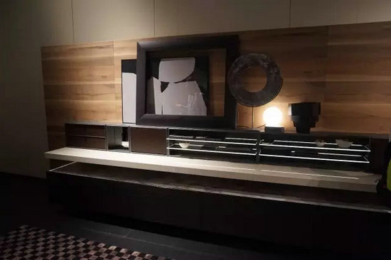 Poliform也在本屆展會(huì)推出了它的新品廳柜系列,護(hù)墻板與墻體無(wú)縫貼合,充滿各式功能的柜體單元懸掛其上。