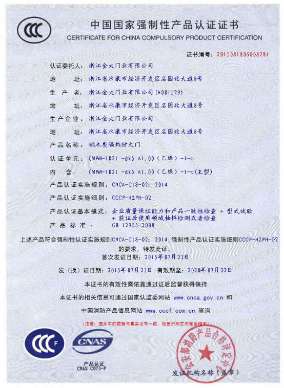 金大門業(yè)獲中國防火門產(chǎn)品質(zhì)量CCC認證