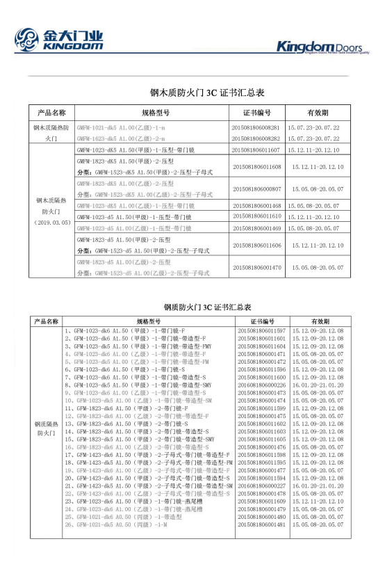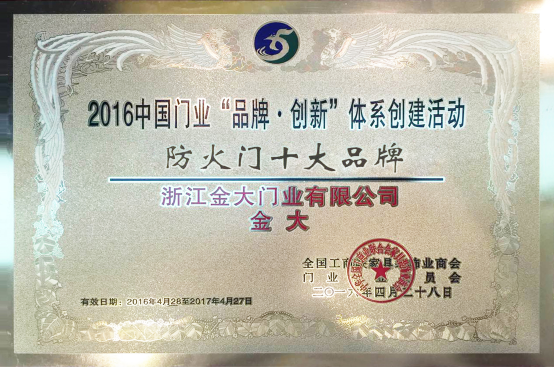 金大門業(yè)的鋼質(zhì)、鋼木質(zhì)防火門嚴格遵守國家標準,始終將產(chǎn)品質(zhì)量置于企業(yè)發(fā)展首位,在耐火關鍵原材料/元器件的采購、防火門制造過程、例行檢驗和確認檢驗等各環(huán)節(jié)嚴加管控,確保生產(chǎn)的產(chǎn)品一致性符合、質(zhì)量穩(wěn)定,也正因如此,金大門業(yè)才有實力獲得國家防火門3C強制性認證的認可,榮獲由全國工商聯(lián)家具裝飾業(yè)商會頒發(fā)的2016中國門業(yè)“品牌·創(chuàng)新”體系創(chuàng)建活動中國"防火門十大品牌"。