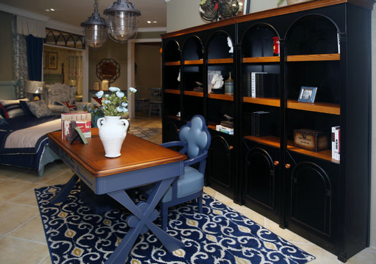 與傳統(tǒng)美式風(fēng)格一樣,美式鄉(xiāng)村風(fēng)格設(shè)計(jì)下的書房,則變得簡單,卻透露著文化氣息,唯一不同的是,軟裝較為豐富。這種風(fēng)格的書房里陳列的被翻卷邊的仿古書籍、顏色泛黃的航海地圖、收獲季節(jié)的油畫、一支單調(diào)的鵝毛筆……即便是簡單的裝飾品,都能為這份文化氣息加多幾分。