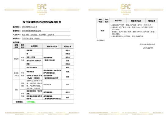 12月23日,中國(guó)綠色家具優(yōu)品2016年四季度10月份抽檢工作完成,作為首批獲證企業(yè),也是優(yōu)品項(xiàng)目典范企業(yè),左右家私以100%合格率順利通過(guò)新一輪的質(zhì)量抽檢,繼續(xù)保持企業(yè)對(duì)于品質(zhì)的專心和用心。