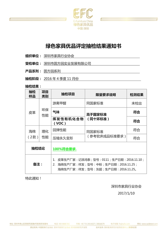 中國綠色家具優(yōu)品工作啟動(dòng)以來,抽檢工作在深圳家具研究開發(fā)院檢測中心(賽德檢測)主導(dǎo)下有條不紊的進(jìn)行。2017年初,2016年4季度11月份的抽檢工作圓滿完成,深圳市圓方圓實(shí)業(yè)發(fā)展有限公司圓方園系列抽檢結(jié)果100%符合。