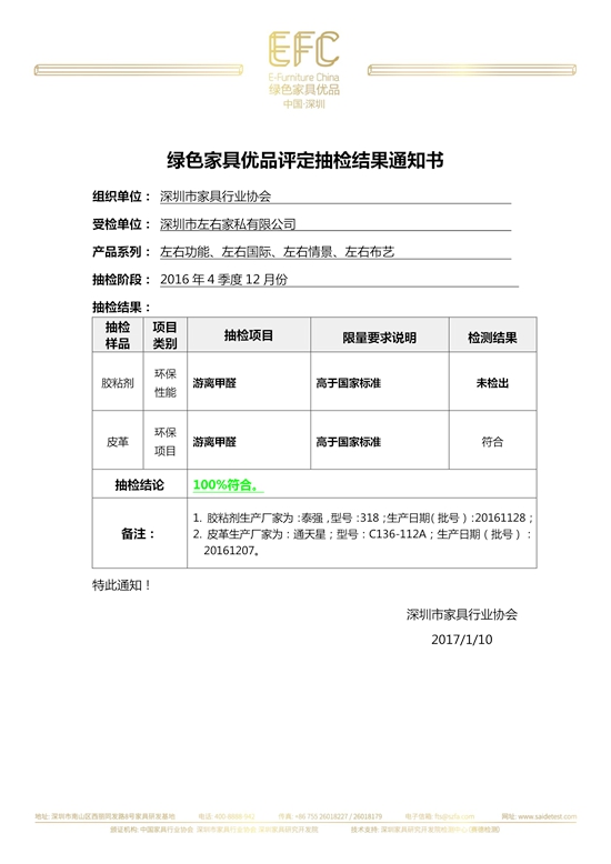 2017年1月10日,2016年中國(guó)綠色家具優(yōu)品四季度12月抽檢結(jié)果正式公布,深圳市左右家私有限公司左右功能、左右國(guó)際、左右情景、左右布藝 被抽取的皮革和膠粘劑的游離甲醛技術(shù)限量均高于國(guó)家標(biāo)準(zhǔn),合格率100%。