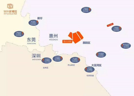 如廣東深惠區(qū)域的家具企業(yè)雖然只有3000多家,但年產(chǎn)值卻高達(dá)2000多個(gè)億,是龍江區(qū)域的十倍,如此巨大的產(chǎn)業(yè)規(guī)模,使得華葉家博園的落成,成為當(dāng)?shù)禺a(chǎn)業(yè)優(yōu)化的關(guān)鍵。華葉家博園距離深圳龍崗、坑梓、坪山、坪地、寶安、東莞沙田、清溪、惠州三和、新圩、大亞灣等家具產(chǎn)業(yè)集聚區(qū)最遠(yuǎn)45分鐘、最短15分鐘車程,對(duì)周邊家具產(chǎn)業(yè)的輻射與集聚效應(yīng)顯著。