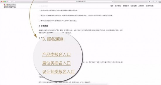 方式2:或者進(jìn)入深圳國(guó)際家具展官網(wǎng),點(diǎn)擊目錄欄“必看亮點(diǎn)”下拉菜單“金汐獎(jiǎng)”進(jìn)入報(bào)名頁(yè)面。