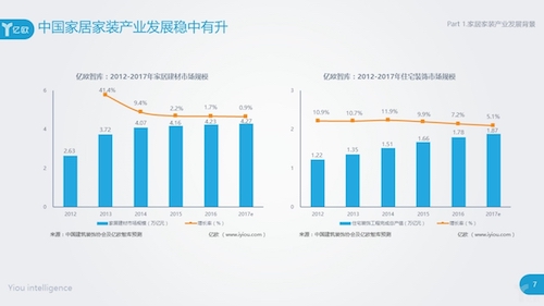 據(jù)中國(guó)建筑裝飾協(xié)會(huì)數(shù)據(jù)顯示,2016年中國(guó)家居建材市場(chǎng)規(guī)模4.23萬億元,其中住宅裝飾市場(chǎng)規(guī)模1.78萬億元。億歐智庫(kù)分析預(yù)計(jì),在政策、經(jīng)濟(jì)、社會(huì)和技術(shù)各因素共同作用下,家居家裝產(chǎn)業(yè)整體市場(chǎng)規(guī)模將穩(wěn)中有升,家居建材市場(chǎng)規(guī)模增速將有所放緩。