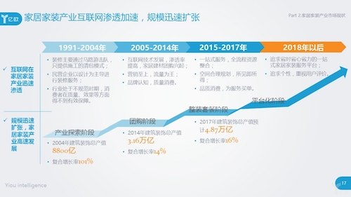 伴隨著互聯(lián)網(wǎng)在家居家裝產(chǎn)業(yè)的加速滲透,從1991年至2016年的26年里,建筑裝飾工程總產(chǎn)值達(dá)到了4.87萬億元,整個(gè)家居家裝產(chǎn)業(yè)從最初的產(chǎn)業(yè)探索階段,經(jīng)歷了團(tuán)購(gòu)階段、整裝套餐階段后,平臺(tái)化開始興起。