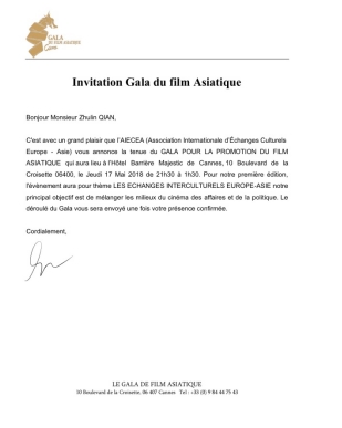 本次活動由戛納政府電影部主辦,歐亞國際文化藝術(shù)交流協(xié)會(Association internationale d'échangeculturel de l'Europe -Asie)承辦,匯聚眾多海內(nèi)外電影人及發(fā)行商,中外媒體、中歐名流名媛、法國商業(yè)聯(lián)盟嘉賓、國際品牌代表方等,為促進(jìn)中法企業(yè)與文化發(fā)展進(jìn)行了深度的交流。