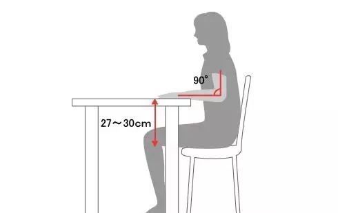 一般來說,椅面到桌面的高度控制在27~30cm左右比較合適,坐著的時(shí)候雙手放在桌面上,手肘與桌面呈90°直角,是比較合適的狀態(tài)。