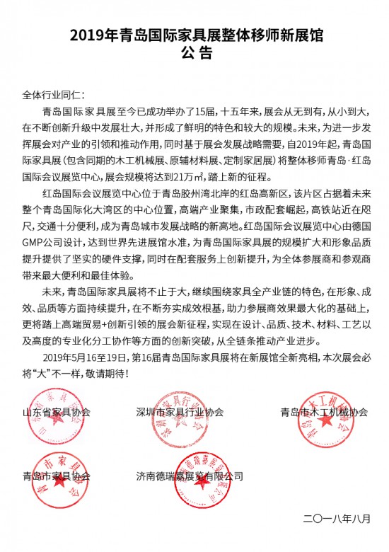 8月24日,青島國(guó)際家具展主承辦單位聯(lián)合發(fā)布公告稱,自2019年起,青島國(guó)際家具展(同期:全屋定制、木工機(jī)械及原輔材料展)將整體移師青島·紅島國(guó)際會(huì)議展覽中心舉辦,屆時(shí)展會(huì)總規(guī)模將達(dá)到210000㎡,舉辦時(shí)間為2019年5月16-19日。