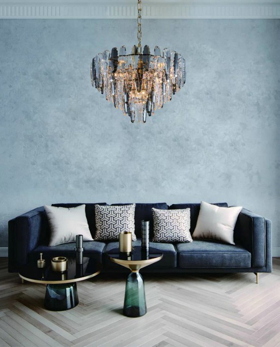 層層疊疊的垂飾,大小不一,體形不一,展現(xiàn)了燈具整體的美感,創(chuàng)造了一種融感性與理性的室內(nèi)環(huán)境。在輕奢風中色彩選擇上,更加自由和灑脫,運用了輕奢最常用的碳灰色,來演繹一種“低調(diào)的奢華”,令空間質(zhì)感更為飽滿。不同的造型、色彩、材質(zhì)、大小能為不同的居室營造不同的光影效果,展現(xiàn)出不同的室內(nèi)氛圍,形成以簡約的設(shè)計、時尚的藝術(shù)、奢華的格調(diào)。