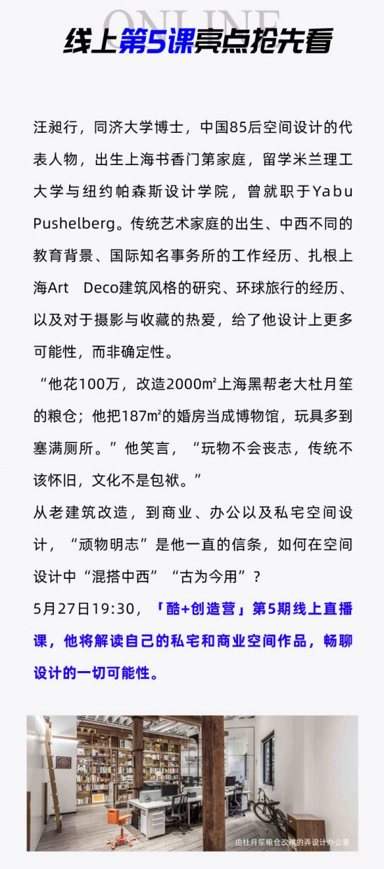 核心提示:酷家樂“酷+創(chuàng)造營”第5期直播即將開播,看85后空間設(shè)計(jì)代表人物如何在設(shè)計(jì)中表達(dá)自我。