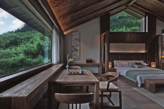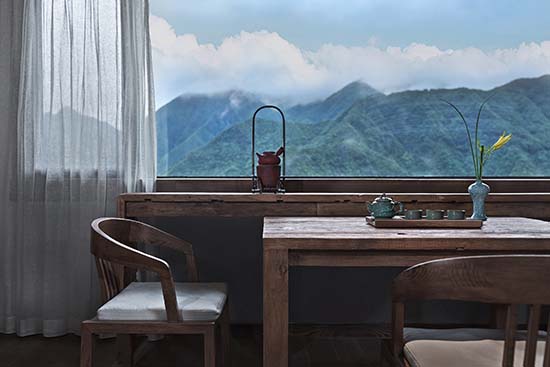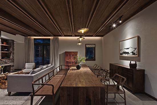 周赫:旗山俠隱的地理位置是在浙江遂昌,山林盡處的古村落里,遂昌本來就是一個(gè)有著1800年歷史的美麗山城。被譽(yù)為“東方莎士比亞”的戲劇大師湯顯祖在此主政5年,創(chuàng)作了不朽名著《牡丹亭》。項(xiàng)目所在的地方跟龍泉市交界,“龍泉寶劍”“龍泉青瓷”都是屬于國家非物質(zhì)文化遺產(chǎn)。項(xiàng)目所在的村子向來都有習(xí)武的傳統(tǒng),并且保留至今??梢哉f,這里是一個(gè)人文薈萃之地。我們是在建設(shè)之初就進(jìn)駐到項(xiàng)目里,深度的考察了當(dāng)?shù)氐母鞣N人文和歷史傳統(tǒng),讓它們適宜的出現(xiàn)在我們的設(shè)計(jì)里,讓來這里入住的人們能夠切身的體驗(yàn)感受到歷史文化的浸潤。在家具和陳設(shè)上大量使用了老榆木,并使用當(dāng)?shù)貍鹘y(tǒng)的匠人技術(shù),純手工打磨,使其具有記憶的紋理。同時(shí)我們也在居民家中回收了一些具有歷史感的老物件,比如榆木小幾,老食盒等。另外,我們選用了當(dāng)?shù)鼐哂刑厣闹袼囈约熬哂?70年歷史的古窯坊青瓷作為客房里的陳設(shè)和一些符號(hào)元素。所有這些,都不是簡(jiǎn)單的堆砌,而是深入到歷史中,去思考它們存在的方式和意義。通過最謙卑的方式來呈現(xiàn)其本真,在做到舒適的體驗(yàn)下盡可能保留過去的記憶和紋理。