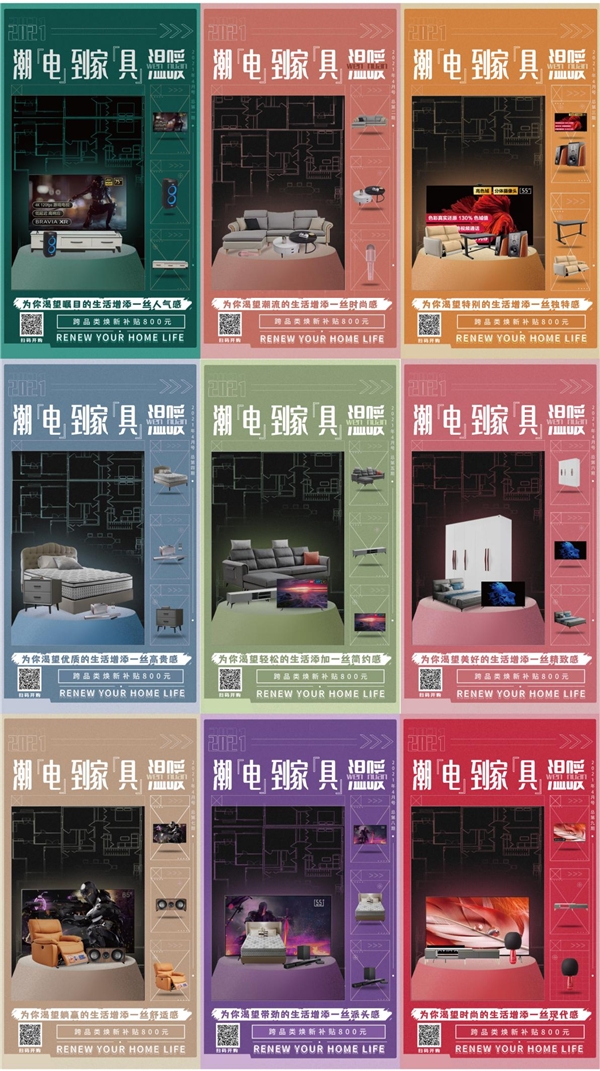 為了全面觸達更多的消費者,讓更多的消費者知道此次活動,并且以最優(yōu)惠的價格入手最優(yōu)質(zhì)的商品,京東電視影音聯(lián)合京東家具,不僅給到了巨額優(yōu)惠,頭號京貼每滿300減30,跨品類煥新補貼800元,以舊換新最高補貼4000元,還聯(lián)合各大社交媒體平臺KOL,圍繞活動主題,打造創(chuàng)新互動話題“潮電煥新家”,并以social海報的形式,給到消費者更貼心的創(chuàng)意搭配和建議。希望借此互動,傳播“京東有潮「電」,新家「具」溫暖”的活動理念,為消費者提供更多有趣、實用且優(yōu)惠的產(chǎn)品。