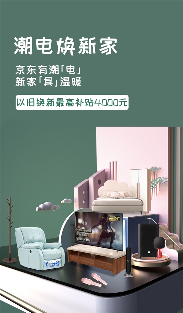 為了讓家中電視影音和家具配得上你的新家,4月15日-4月20日,京東電視影音聯(lián)合京東家具,發(fā)起“潮電煥新家”活動,頭號京貼每滿300減30,跨品類煥新補貼800元,以舊換新最高補貼4000元,通過巨額補貼和創(chuàng)意內(nèi)容,不僅致力于為消費者提供更多的家裝煥新的產(chǎn)品選擇,也希望借此將“京東有潮「電」,新家「具」溫暖”的活動理念傳達給消費者。