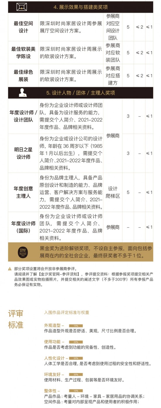 為更好地順應(yīng)時(shí)代發(fā)展趨勢(shì),發(fā)掘出更具普世價(jià)值的設(shè)計(jì)作品,2022年金汐獎(jiǎng)決定對(duì)“評(píng)審、獎(jiǎng)項(xiàng)和傳播推廣”進(jìn)行全面革新,由內(nèi)而破。它將強(qiáng)化對(duì)作品價(jià)值觀(包括設(shè)計(jì)理念、人性化關(guān)懷、設(shè)計(jì)價(jià)值觀、可持續(xù)理念、社會(huì)責(zé)任感等深層次要素)的洞察、審視和反思,以推舉出真正代表中國(guó)未來設(shè)計(jì)水平、有獨(dú)立思考、實(shí)踐能力、并對(duì)行業(yè)作出示范作用和貢獻(xiàn)的優(yōu)秀作品、設(shè)計(jì)師。