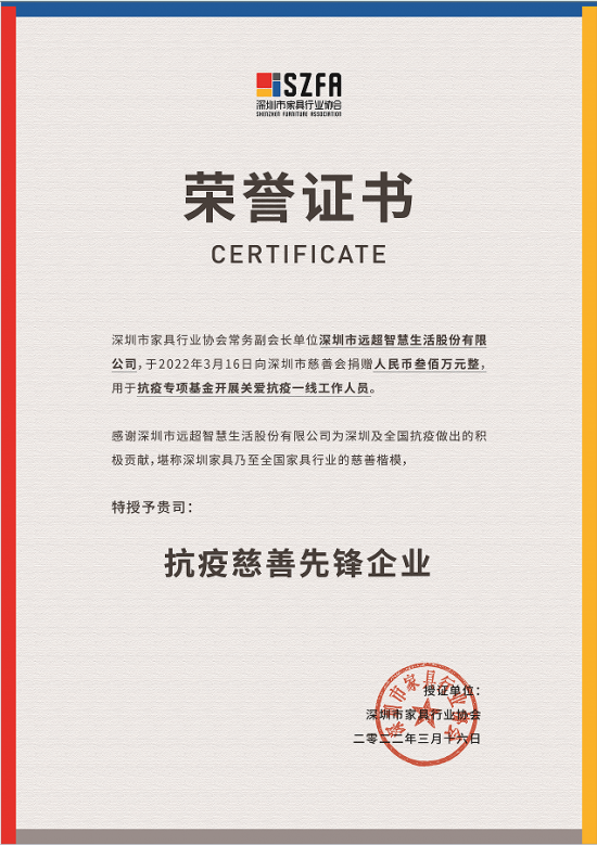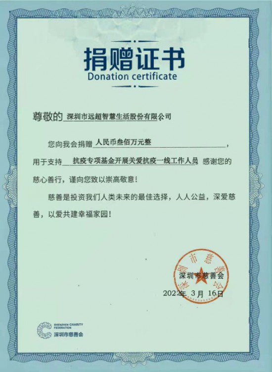 為支持深圳疫情防控,3月16日,深圳遠(yuǎn)超智慧生活股份有限公司(即CBD家居)向深圳市慈善會(huì)捐贈(zèng)抗疫專項(xiàng)基金共計(jì)300萬元,以表達(dá)對(duì)一線抗疫人員的支持與關(guān)懷和與深圳社會(huì)各界攜手抗疫的決心。