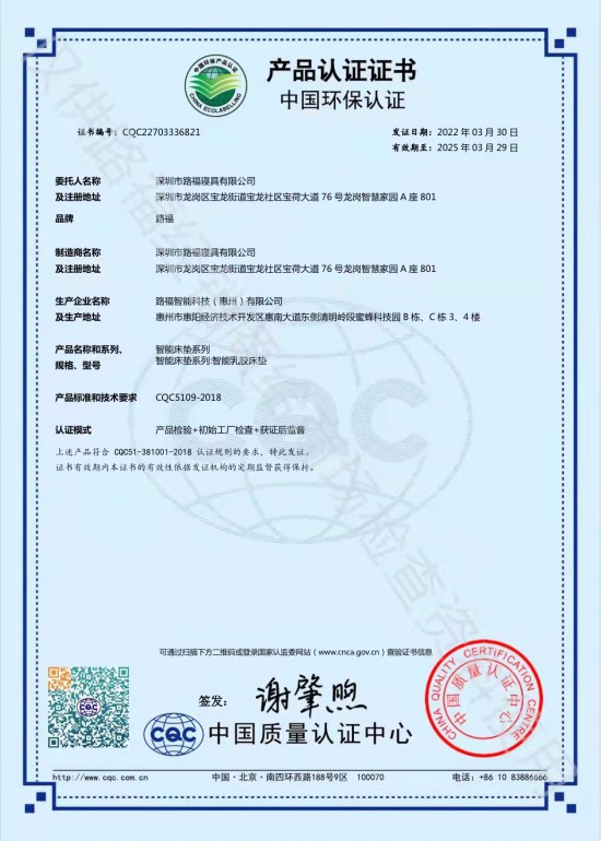 近日,中國(guó)質(zhì)量認(rèn)證中心(英文簡(jiǎn)稱:CQC)向“深圳市路福寢具有限公司”(以下簡(jiǎn)稱:路福)頒發(fā)了智能床墊系列、床墊系列、軟體床系列的中國(guó)環(huán)保產(chǎn)品認(rèn)證證書。路福積極響應(yīng)國(guó)家環(huán)保產(chǎn)業(yè)政策號(hào)召,主動(dòng)肩起負(fù)企業(yè)社會(huì)責(zé)任,啟動(dòng)了向CQC申報(bào)中國(guó)環(huán)保產(chǎn)品認(rèn)證工作,歷時(shí)壹年時(shí)間,經(jīng)過資料編撰、產(chǎn)品檢測(cè)、體系運(yùn)行、內(nèi)部檢查、CQC分中心派員核查、問題整改等環(huán)節(jié),最終通過審核獲得證書。