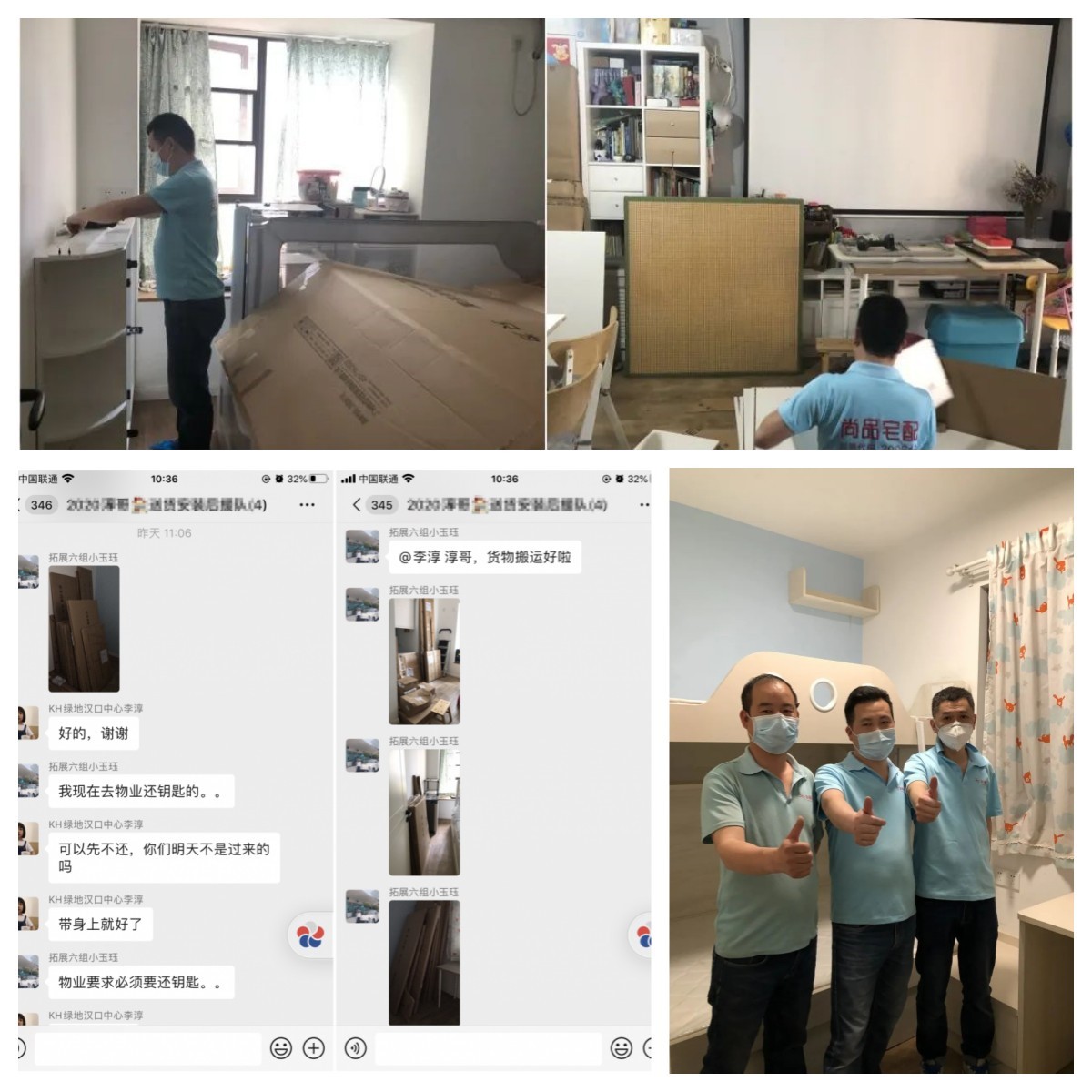 陳經(jīng)理在與物業(yè)溝通后,提前做好準(zhǔn)備,反復(fù)與師傅確定具體上門時間以及安裝人數(shù)。由于客戶在老家沒回到武漢,陳經(jīng)理建立起“客戶家送貨安裝后援隊”的微信群,設(shè)計師上門幫客戶收貨,在群里播報送貨進(jìn)度,師傅送完后讓設(shè)計師把收貨清單發(fā)在群里讓客戶確認(rèn),實時為客戶播報現(xiàn)場情況使其放心。