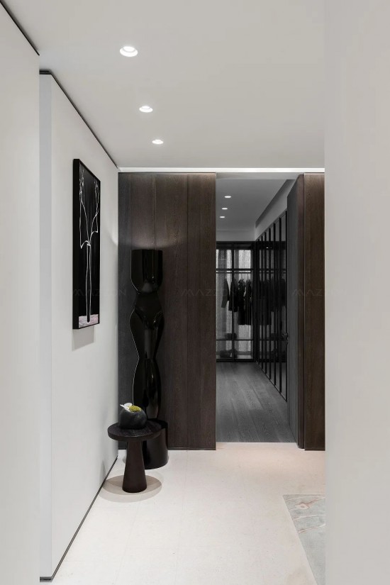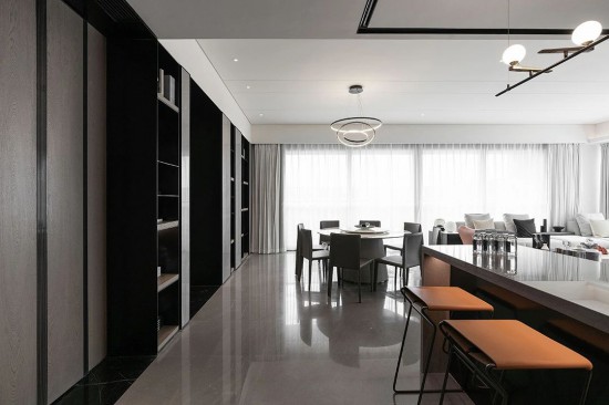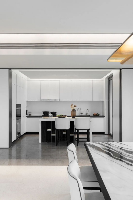 推門而入,從幽然的玄關(guān),移步至客餐廳,視野有種豁然開朗之感。素簡(jiǎn)的白色立面與深色金屬,黑與白的碰撞,為新家營造了詩意寧靜的氣質(zhì)。