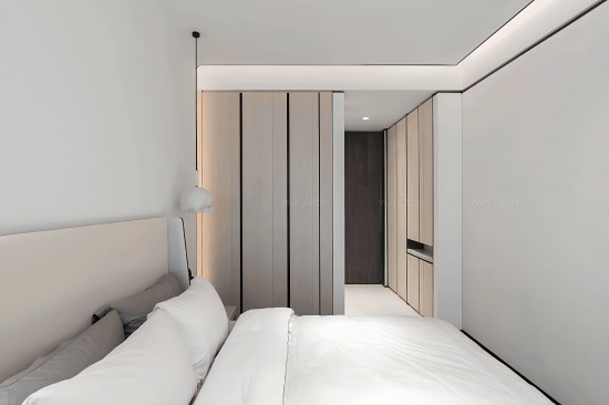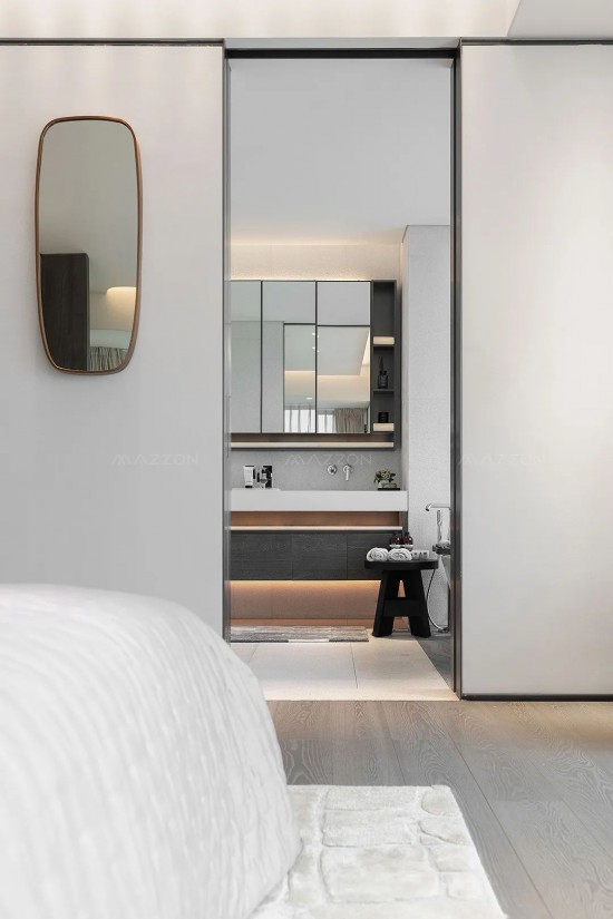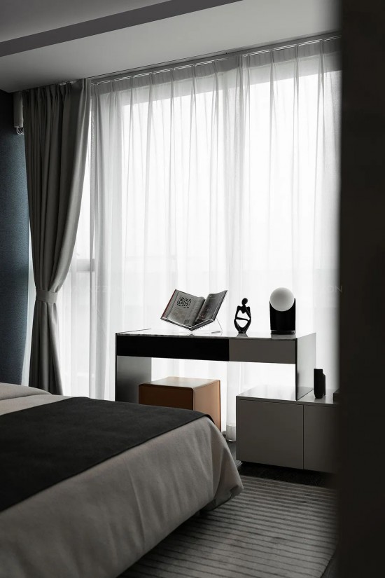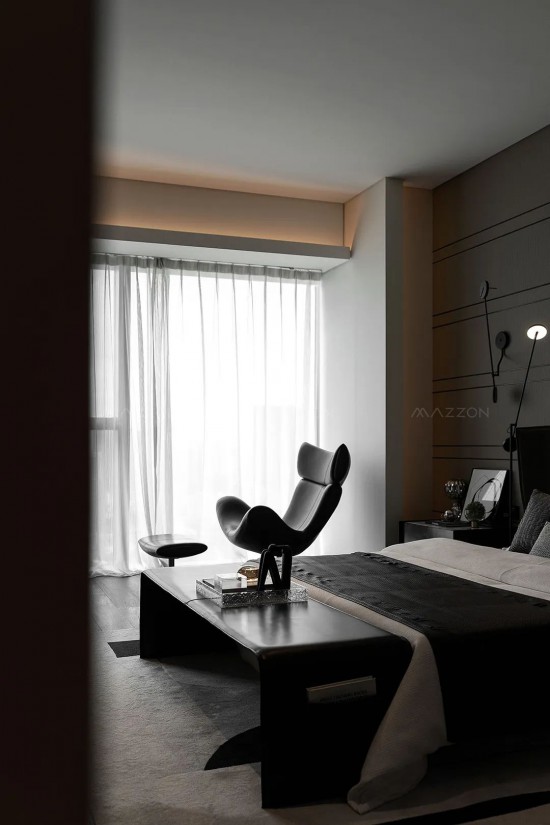 套房式的主臥,是專屬周先生與妻子的小天地。瞰景大飄窗、獨(dú)立衛(wèi)浴、私人衣帽間,在這里可以隔絕世界喧囂,悠享白天的從容優(yōu)雅與夜間的私密安靜。