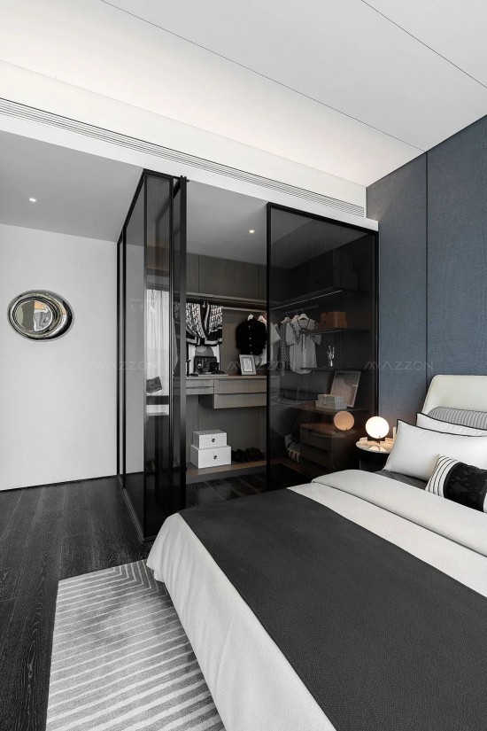 步入主臥,大面積的落地窗,每天清晨都能被窗外的極致美景所喚醒。頗具藝術(shù)審美的衣帽間,開放的布局,衣物整潔利落地?cái)[放,視覺所到之處,是屬于家庭的優(yōu)雅與體面。
