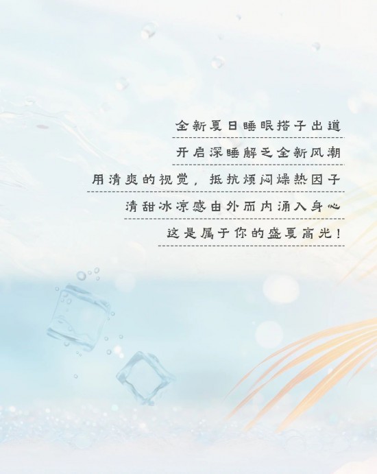 核心提示:全新夏日睡眠搭子出道,開啟深睡解乏全新風潮,用清爽的視覺,抵抗煩悶燥熱因子,清甜冰涼感由外而內(nèi)涌入身心,這是屬于你的盛夏高光!