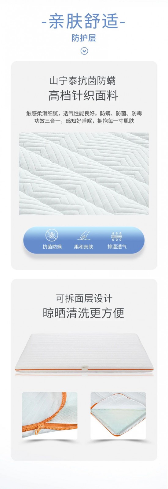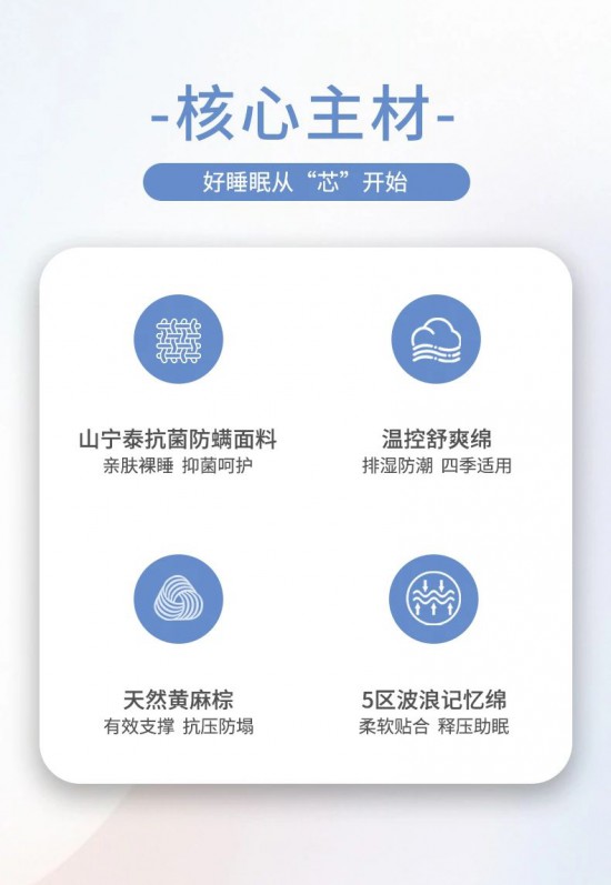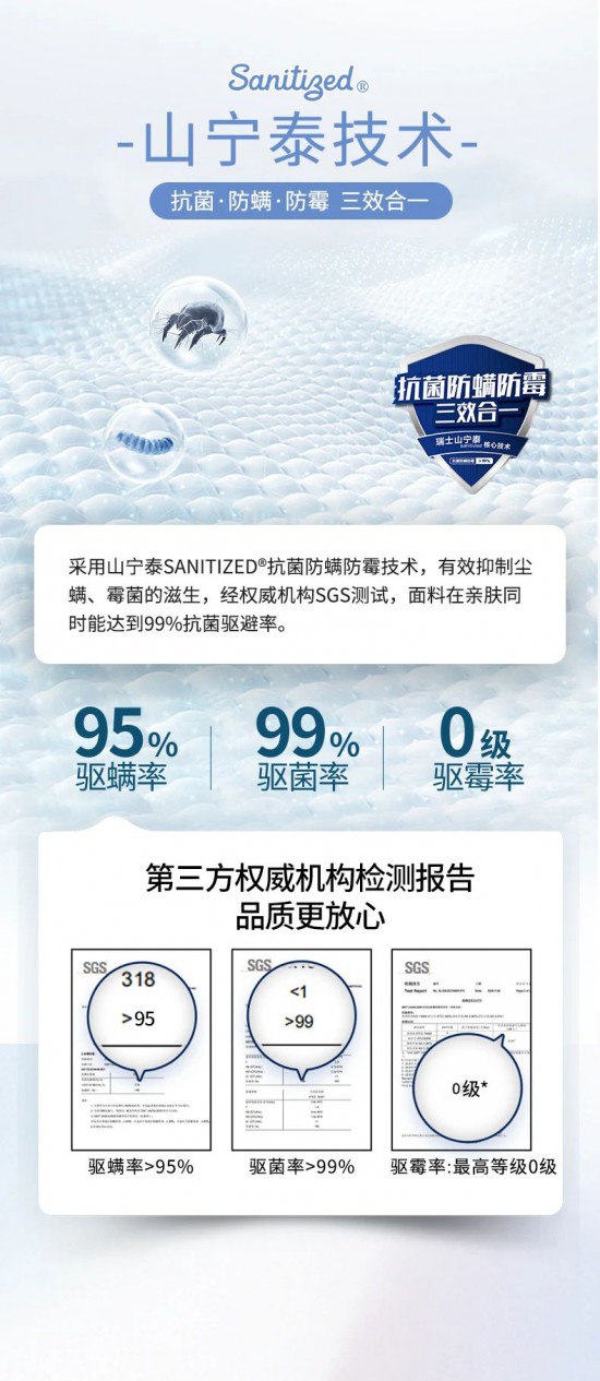 核心提示:山寧泰抗菌防螨,高檔針織面料觸感柔滑細膩,透氣性能良好,防螨、防菌、防霉功效三合一,感知好睡眠,擁抱每一寸肌膚。