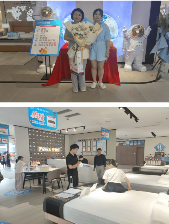 公司大力支持此次花都五一活動,活動現(xiàn)場布置精美禮品堆擺放,吸引顧客到店親身體驗歐露絲太空艙床墊產(chǎn)品,促進現(xiàn)場接連開單!