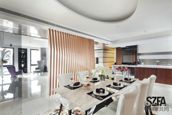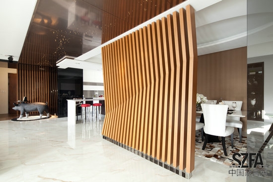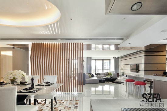 “光線、動(dòng)線與質(zhì)感”為品宅的設(shè)計(jì)概念,天花板的設(shè)計(jì)主要是保持空間高度,并以全局照明的概念處理,入口玄關(guān)與餐廳的天花板是空間的最低點(diǎn),玄關(guān)地面為倒角實(shí)木地板,強(qiáng)化腳踩的感受,進(jìn)入到客廳之后空間感因天花與木格柵產(chǎn)生變化,而地面也轉(zhuǎn)換成大理石,這點(diǎn)是考慮人從外面嘈雜的環(huán)境回到家中,第一個(gè)感受應(yīng)該是平靜、穩(wěn)定感,隨著不同空間與光影變換,讓心理慢慢放松,天花上的銀河狀光纖則是體現(xiàn)業(yè)主的浪漫個(gè)性。