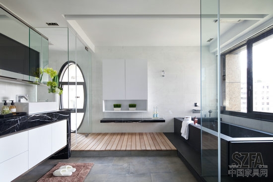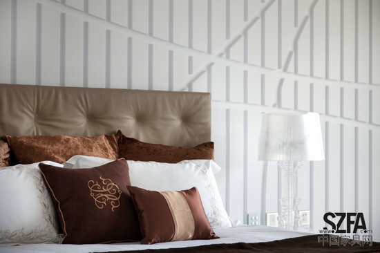 主臥室內(nèi)則彷佛成為業(yè)主心靈的呈現(xiàn),以白色系為主的空間,象征女性的單純,主床頭墻的格柵延續(xù)公共空間的造型,并勾上隨性的比例,床頭前方為白色鱷魚皮門板與白色烤漆柜,當(dāng)光影隨著紋理灑落時(shí),是白色的空間中的驚喜;轉(zhuǎn)進(jìn)更衣間,第一眼可見到Stars War pop art ,天花板上則是Swarovski Crystal Lamp,主浴室整體使用復(fù)古面南非理石,搭配柚木實(shí)木地板,呈現(xiàn)舒適感受,洗手臺(tái)上方鏡柜崁入電視,方便業(yè)主晨間、夜晚能收看新聞。