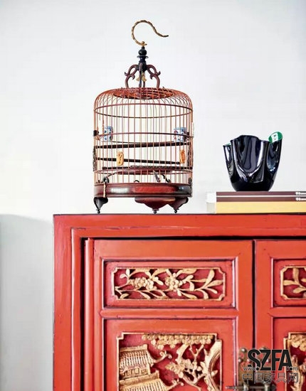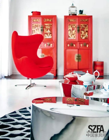 客廳。中國的傳統(tǒng)雕花立柜和蛋椅因為都是紅色,而絲毫沒有違和感。