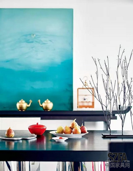 餐廳一角。簡約風的中國案幾上是馮勃最愛的一幅畫。