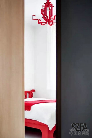 客臥一角。不變的紅與白主題,簡化成現(xiàn)代設計線條的宮燈是空間的亮點。