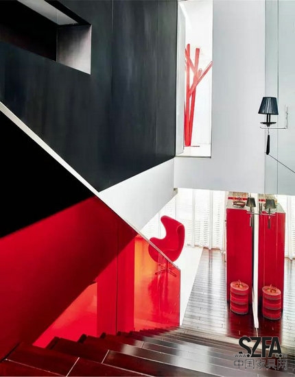 一樓至二樓樓梯的紅色護欄與二樓步入式衣帽間的外墻,形成空間中“紅與黑”的一個趣味篇章,為二樓整體的白色調(diào)調(diào)味。