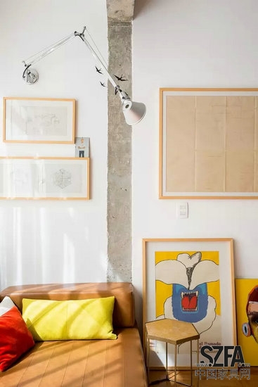 古舊的椅子,還有作為墻飾的各式各樣的年歲尚老的收藏品,讓工業(yè)感極強(qiáng)的空間也彌漫出一股恰當(dāng)?shù)娜宋臍庀?,顯得不那么冰冷。跳躍的色彩搭配也為屋子注入一絲活力。