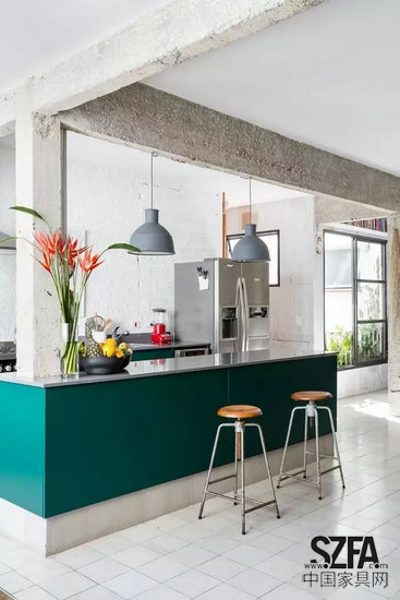 風(fēng)格感極強(qiáng)的仿古瓷磚讓廚房多了一絲靜謐感,裸露的磚墻和混凝土柱產(chǎn)生強(qiáng)烈的對(duì)比,破舊的墻壁也和天花板上的痕跡相互呼應(yīng),讓廚房空間顯得別致而有趣。
