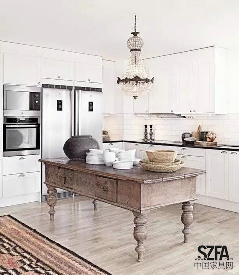 異常出彩的餐桌與復古吊燈讓原本平淡的廚房瞬間逼格爆棚。