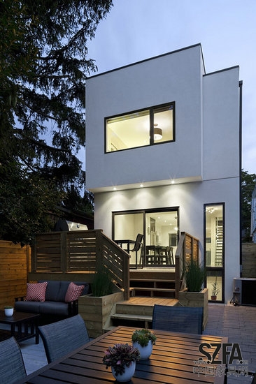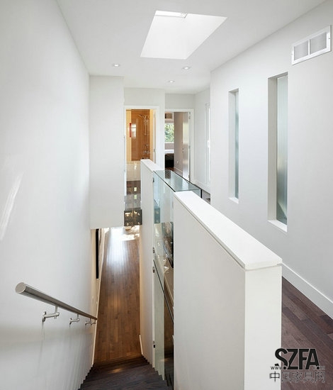 在主要樓層,甚至盡管居家房間只有十六英尺寬,臥室面積只有十四英尺寬,這里也并沒有感覺受到約束的感覺。這都要?dú)w功于位于臥室的十一英尺天花板與分離的地板設(shè)計,這就消除了對于燈光缺乏的墻體的制約。當(dāng)你站在房子前面面對著生活區(qū)域,一個來自于細(xì)長窗子的盤旋燈光覆蓋了這個房間的三個立面,展現(xiàn)出了一種全景視角。房子的后面位于家庭房間另一側(cè),那里在后部平臺旁邊有一個外凸的窗子,它從主層樓板延伸到了地下一層。你會情不自禁的沐浴在陽光與這開敞空間里。在第二層,巨大的窗口設(shè)計用在臥室與走廊之間的銜接墻體上,讓開放的感覺彌漫。這樓的另一個非常特殊的特征是步入陽臺,它可以連接臥室與主套房。