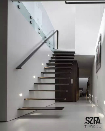 主起居空間面向河道,在上層的空降采光充足,使本來狹長的空間顯得明亮通透。干凈簡約的懸浮樓梯連接上下層空間。
