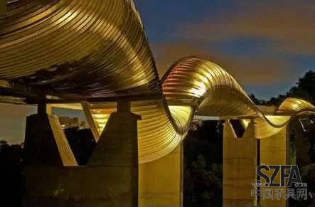 翻滾吧,大波浪,還是金色的,真是富貴奢華有內(nèi)涵,這座橋給人視覺上的沖擊力極強。整個橋身有4個波峰和3個波谷,采用無障礙設(shè)置,不設(shè)階梯,但有扶手,樓面是采用防滑的材料,干得漂亮!