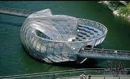 乍一看這造型,跟咱們的鳥巢有點像,挺抓人眼球。中間銀色貝殼類的東西是個島嶼,設(shè)有日光浴區(qū)、酒吧、咖啡館、露天表演場等場所,兩側(cè)以橋梁連接到岸邊,被譽為是夢幻與現(xiàn)實融合的經(jīng)典之作。