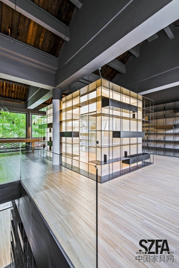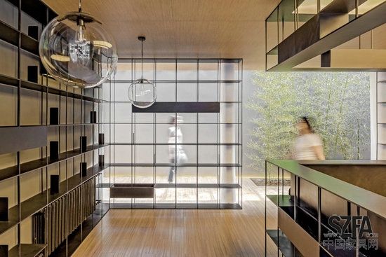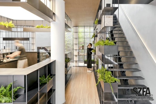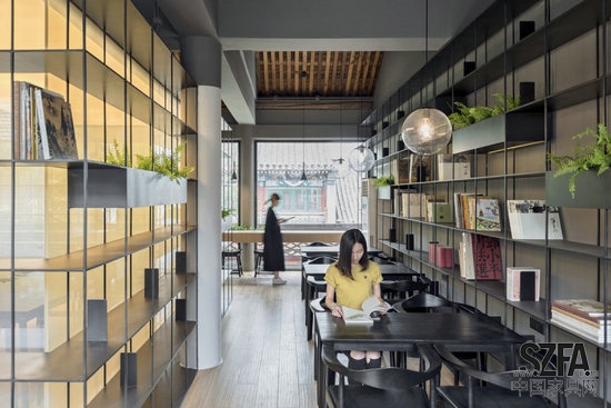 為了改變傳統(tǒng)書店粗重、刻板的形象,新的設(shè)計(jì)利用通透、輕盈的鐵制書架整合功能、交通、設(shè)備與照明,并將綠色植物置入其中,使得新的內(nèi)部空間界面更加連續(xù)開放和富于生機(jī)。